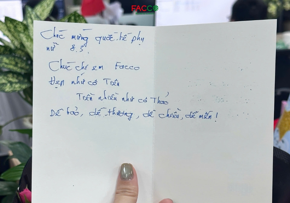 Trong hành trình phát triển của Facco, các nữ cán bộ nhân viên luôn đóng vai trò quan trọng. Bằng sự tận tâm, bền bỉ và tinh thần trách nhiệm, các chị em đã góp phần tạo nên những giá trị tích cực cho tập thể. Nhân dịp đặc biệt này, Facco xin gửi lời cảm ơn tới toàn thể các nữ nhân viên – những người đã và đang đóng góp thầm lặng nhưng vô cùng ý nghĩa cho sự phát triển chung của công ty. Xin cảm ơn các anh em Facco vì sự chu đáo và tình cảm dành cho các nữ đồng nghiệp.