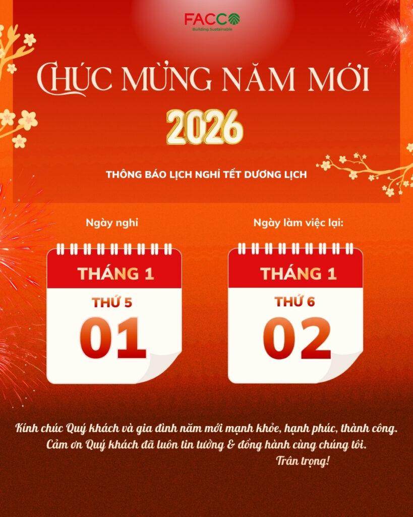 Để thuận tiện cho việc sắp xếp công việc, Facco xin gửi đến Qúy khách hàng lịch nghỉ Tết Dương 2026 như sau: