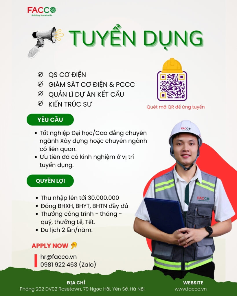 Tại Facco – Tổng thầu xây dựng công nghiệp hàng đầu, bạn sẽ được làm việc trong hệ sinh thái dự án đa dạng, tiêu chuẩn thi công cao, tiếp xúc trực tiếp với các chủ đầu tư lớn và quy trình quản lý hiện đại, kèm theo các chính sách hấp dẫn.